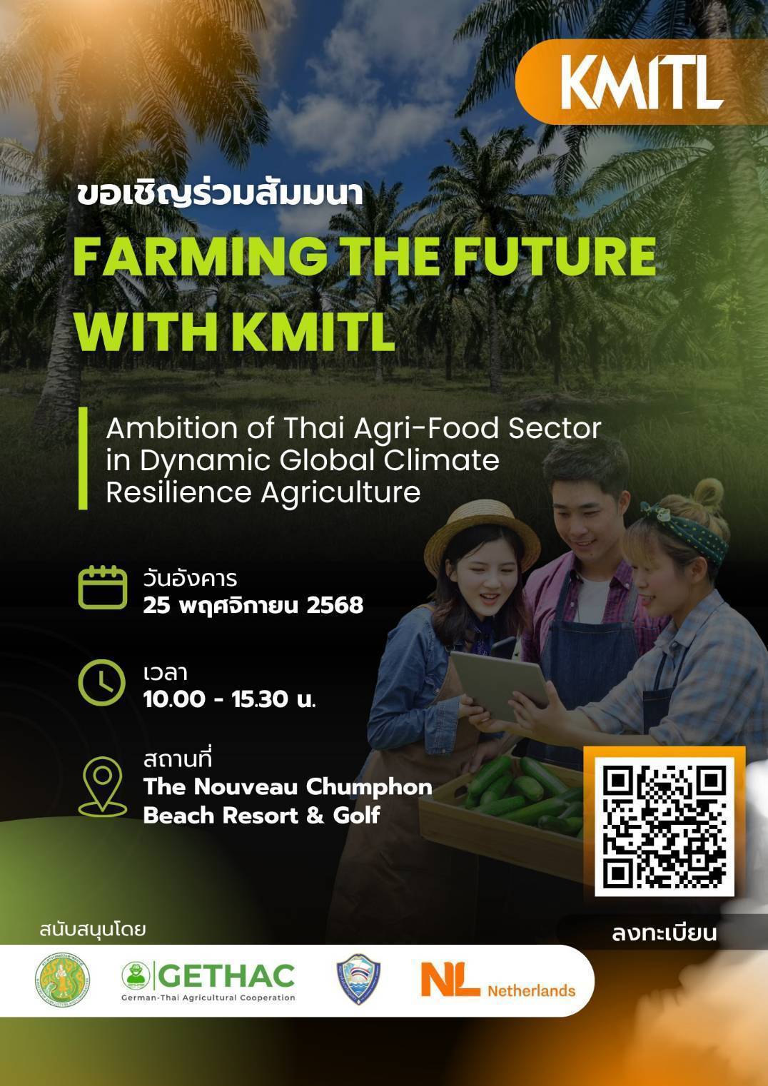 สถาบันเทคโนโลยีพระจอมเกล้าเจ้าคุณทหารลาดกระบัง (สจล) ร่วมกับกระทรวงเกษตรและสหกรณ์ สถานเอกอัครราชทูตราชอาณาจักรเนเธอร์แลนด์ โครงการความร่วมมือระหว่างเยอรมัน – ไทย เพื่อส่งเสริมระบบการบริหารจัดการด้านการเกษตรอย่างยั่งยืน ผ่านเครือข่ายนวัตกรรม (GETHAC) และ หอการค้าจังหวัดชุมพร ขอเชิญ นักวิชาการเกษตร เกษตรกรและผู้ผลิตสินค้าเกษตร ผู้ประกอบธุรกิจการเกษตร และ ผู้สนใจทั่วไป เข้าร่วมการสัมนา “Farming The Future With KMITL 2025: Ambition of Thai Agri-Food Sector in Dynamic Global Climate Resilience Agriculture”