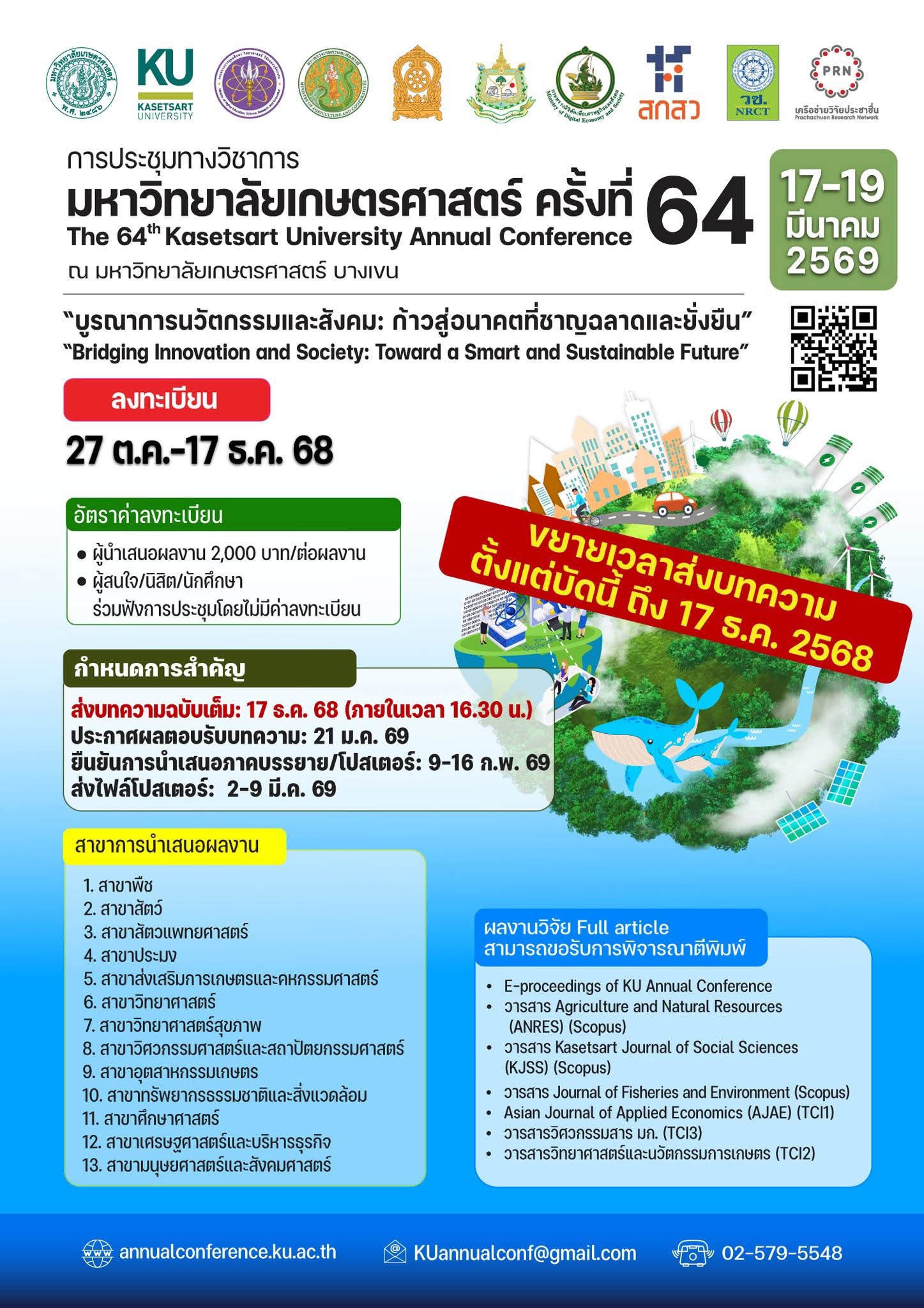 ✨ขอเชิญชวนผู้สนใจส่งผลงานทางวิชาการ และเข้าร่วมการประชุมทางวิชาการ มหาวิทยาลัยเกษตรศาสตร์ ครั้งที่ 64 ✨
