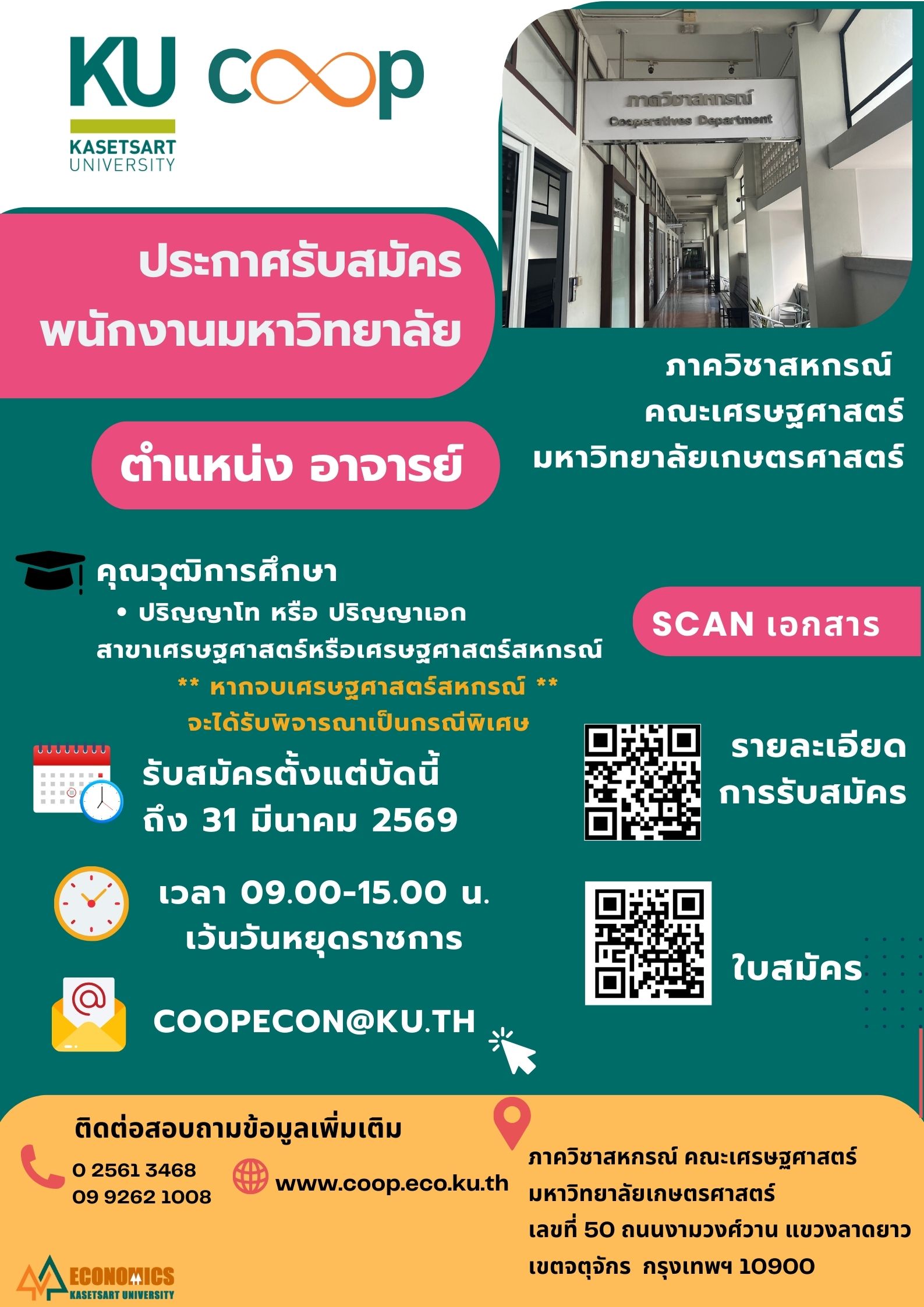 ประกาศขยายรับสมัครพนักงานมหาวิทยาลัย ตำแหน่งอาจารย์ 1 อัตรา สังกัดภาควิชาสหกรณ์ วุฒิปริญญาโท/ปริญญาเอก ปิดรับสมัคร 31 มีนาคม 2569