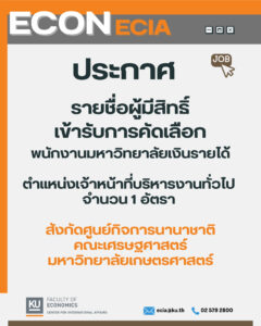 *โปรดอ่านรายละเอียดเพิ่มเติม “ประกาศคณะเศรษฐศาสตร์ มหาวิทยาลัยเกษตรศาสตร์ เรื่อง รายชื่อผู้มีสิทธิ์เข้ารับการคัดเลือก กำหนดวัน เวลา สถานที่สอบ และระเบียบเกี่ยวกับการคัดเลือก”